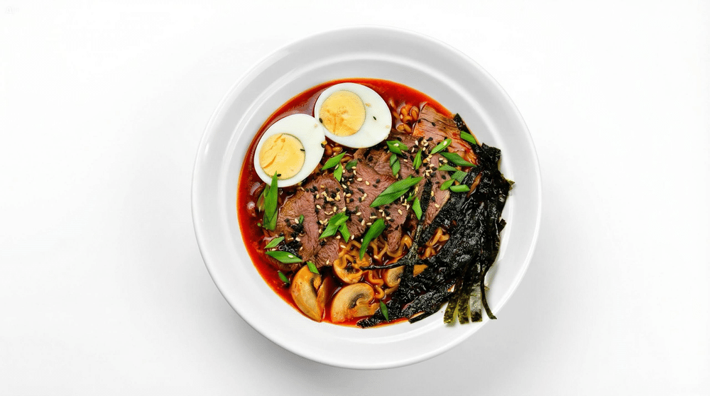 Пшеничная лапша, Яйцо куриное, Шампиньоны, Помидоры черри, Говядина, Нори, Кунжут, Зеленый лук.