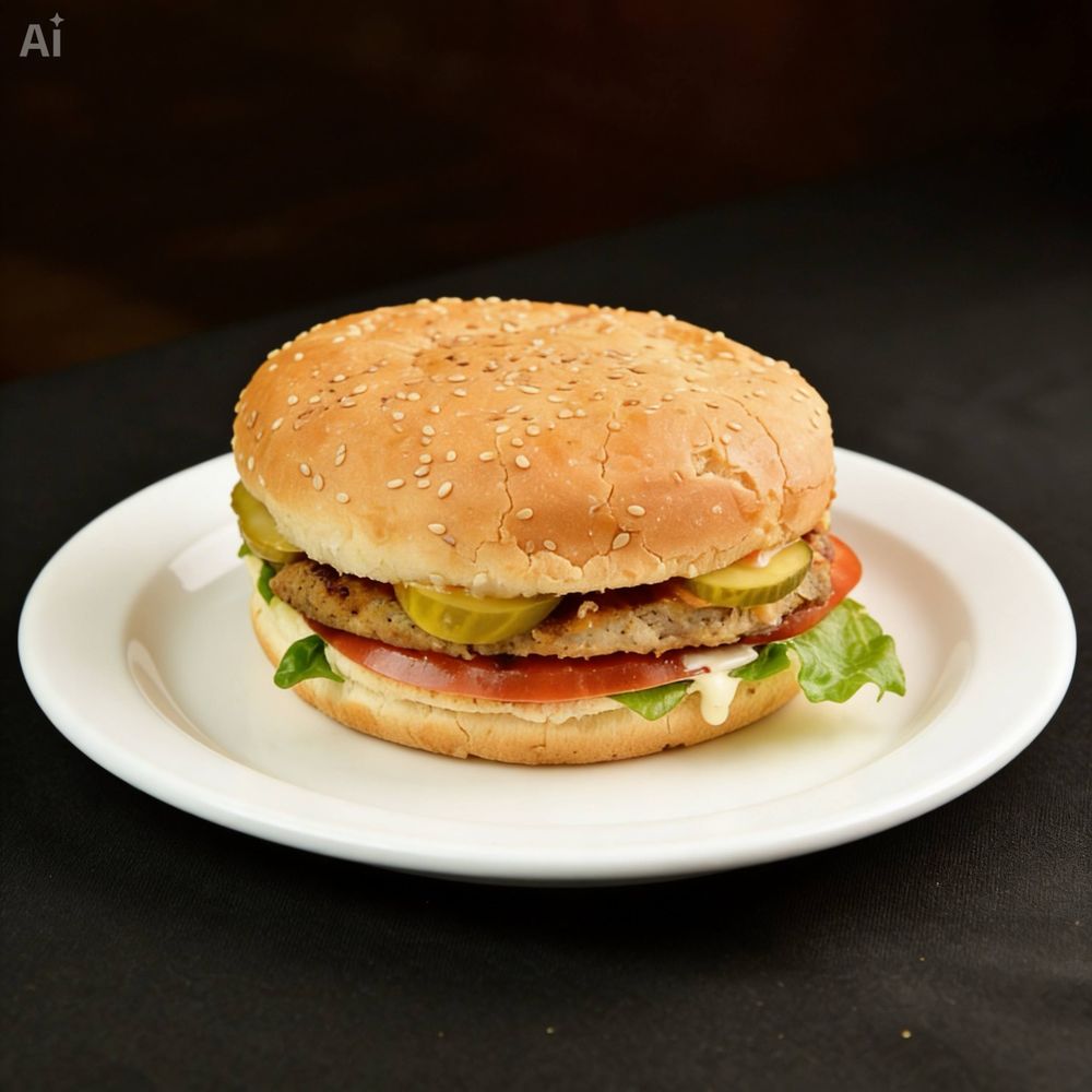 Булочка, Котлета куриный, Соус чесночный, Соус горчичный, Айсберг, Помидор, Солёные огурцы.