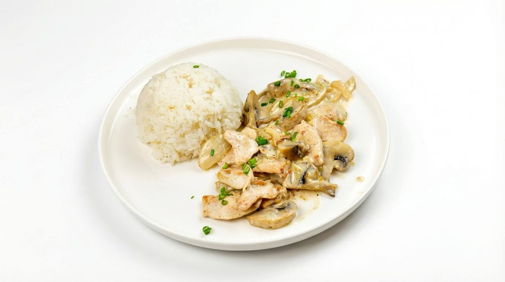Филе, Шампиньоны, Лук, Сливки, Чеснок, На выбор гарнир рис|пюре.