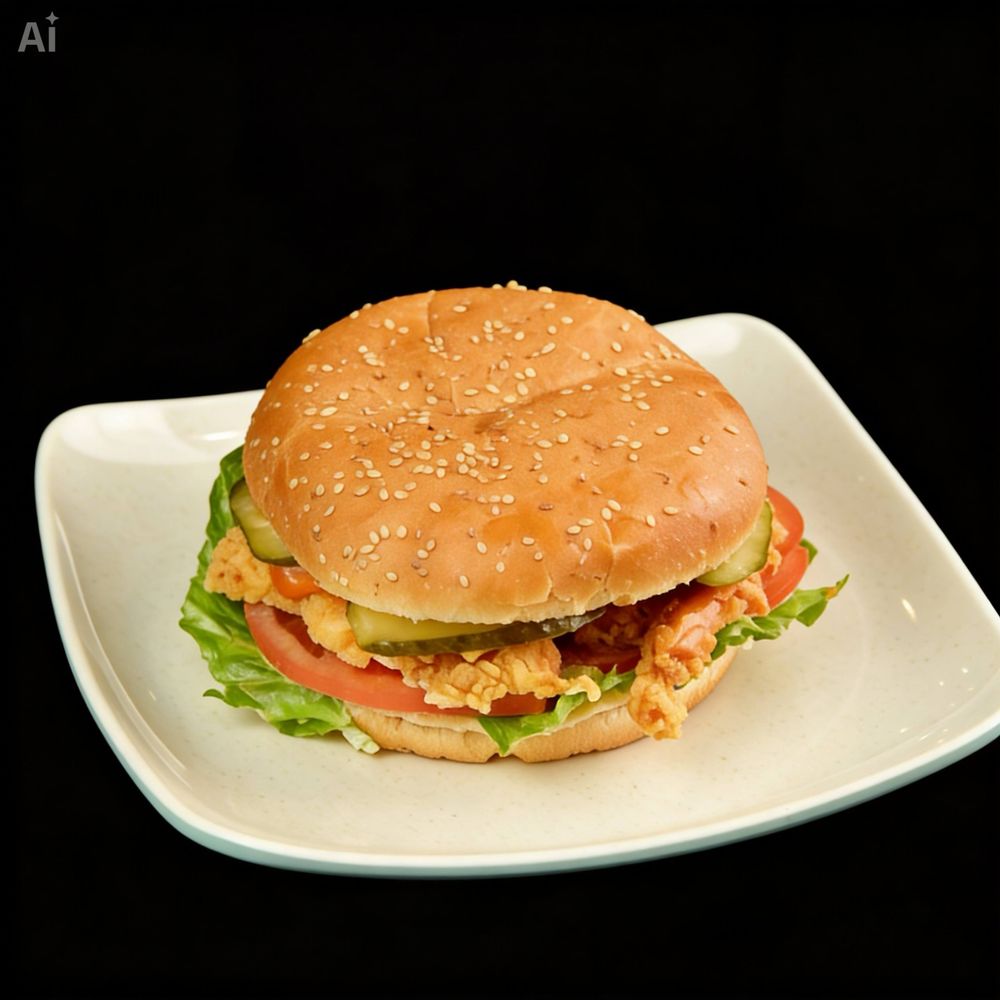 Булочка, Стрипсы, Сыр чеддер, Айсберг, Соус горчичный, Помидор, Соус чесночный, Соленые огурцы.
