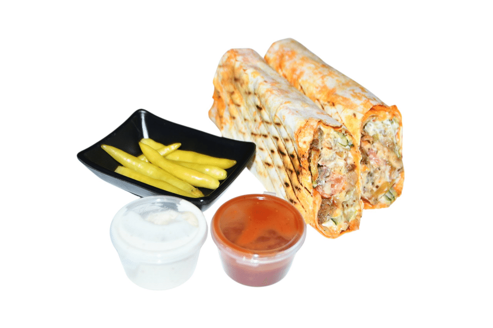 Лаваш, Филе куриное, Картофель, Майонез, Соленые огурцы.