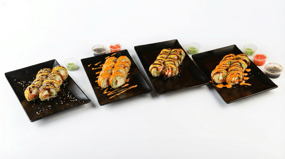 Американо с лососем 8шт. Американо острый 8шт. Цезарь с курицей 8шт. Лас-Вегас 8шт. Кола 1л.