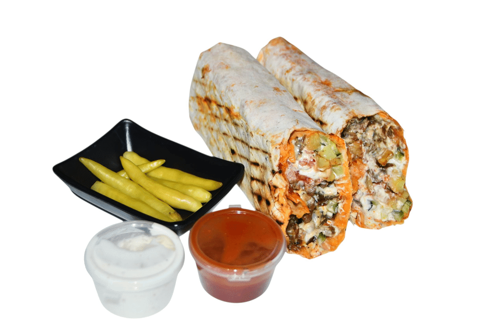 Лаваш, Говядина, Картофель, Огурцы, Помидор, Соус чесночный, Соус горчичный.
