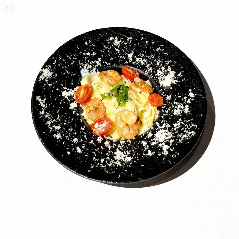 Фитучини, Креветки, Сыр пармезан, Помидор черри.