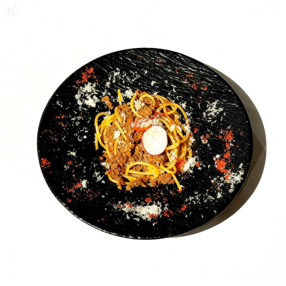 Фитучини, Фарш говяжий, Сыр пармезан, Помидор черри.