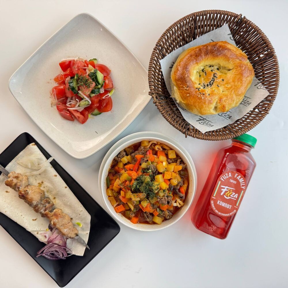 Суйру лагман 1 порция Шашлык филе окорочка 1 порция Лепешка 1шт Салат свежий с маслом Компот 0,5л