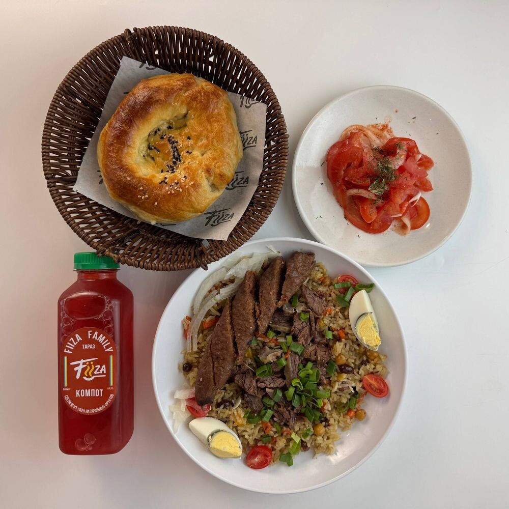 Плов классический 1 порция Шашлык люля-кебаб 1 порция Лепешка 1шт Салат ачучук 1шт Компот 0,5л
