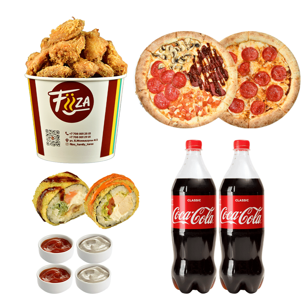 CLASSIC Крылышки 30шт. Пицца 4 сезона. Пицца пепперони. Американо с лососем 8шт. Цезарь с курицей 8шт. Соусы 2шт. Кола 1л.