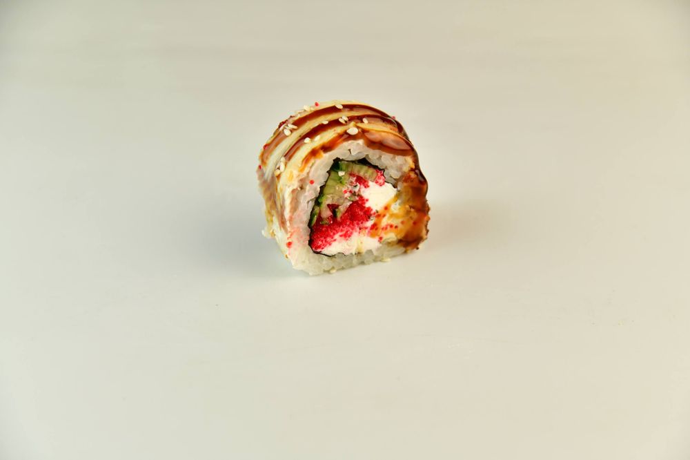 Рис, Нори, Сыр творожный, Огурцы, Икра масаго, Угорь, Соус унаги, Кунжут.